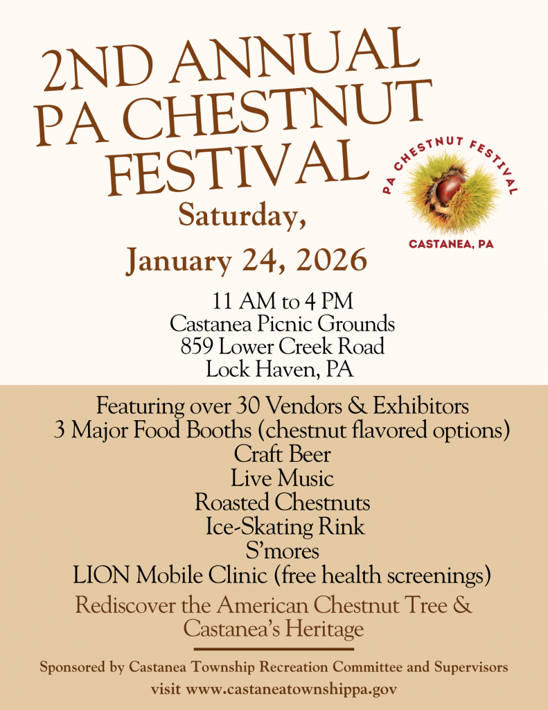 The Castanea Township Supervisors are accepting letters of interest to serve on the Zoning Appeals Board. Applicants can send their letter of interest to Castanea Township, 347 Nittany Road, Lock Haven, PA 17745, email secretary@castaneatownshippa.gov, or can drop off at the Township Building.
